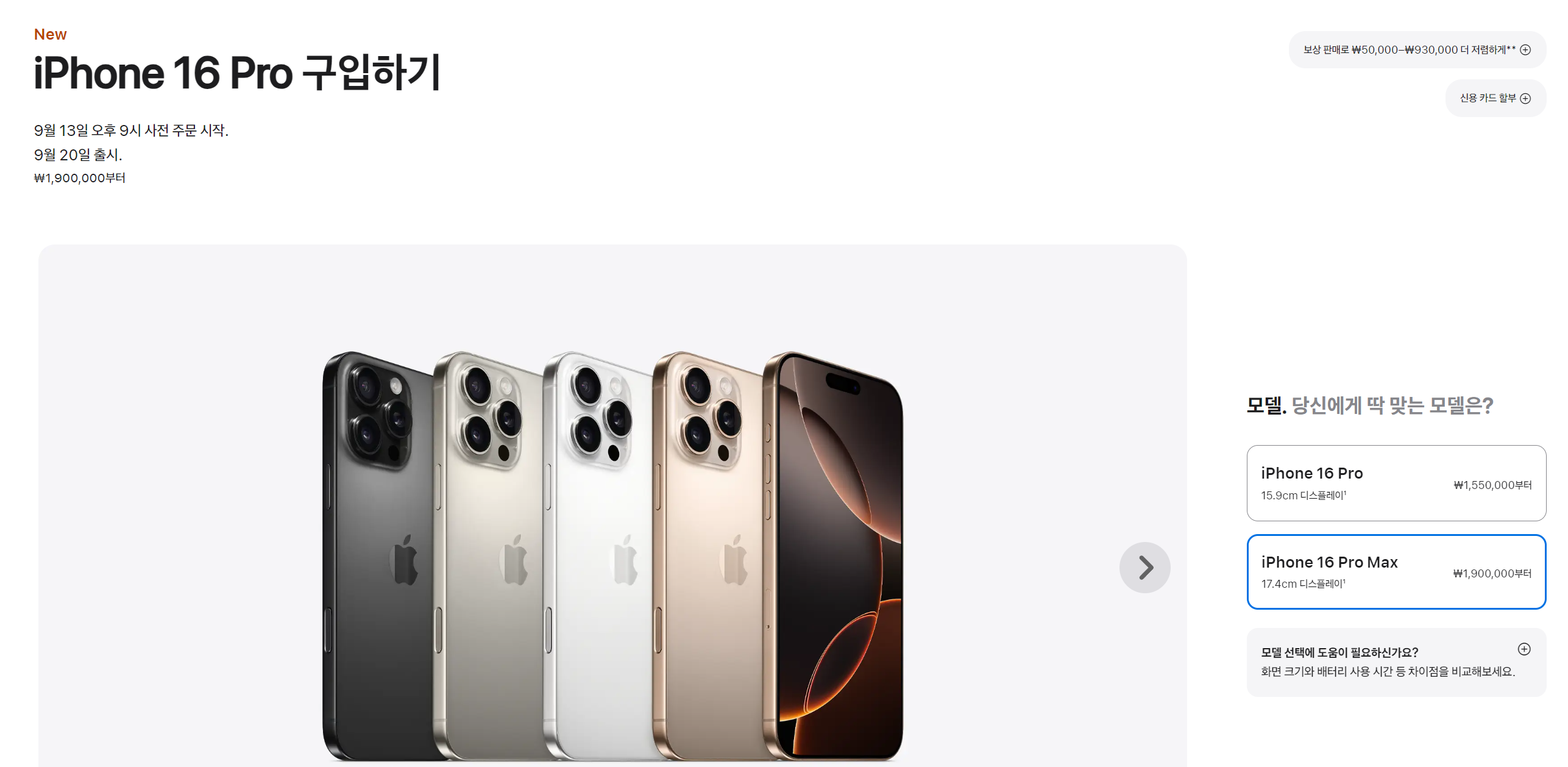 아이폰 16프로도 15프로와 동일한 가격인 155만원부터 프로맥스 190만원부터이다.