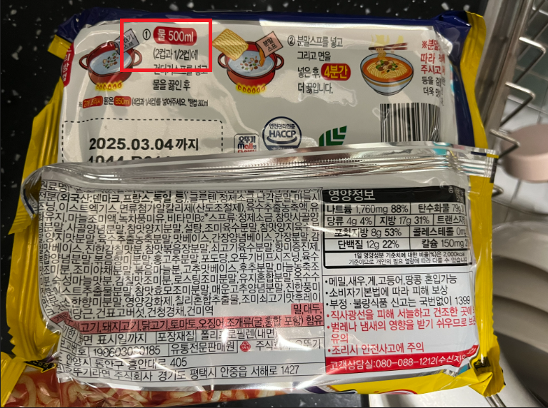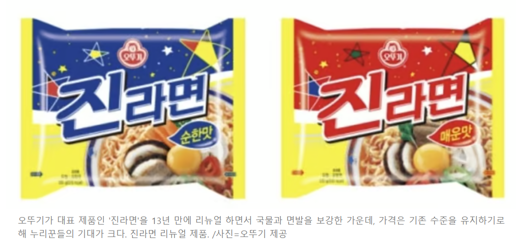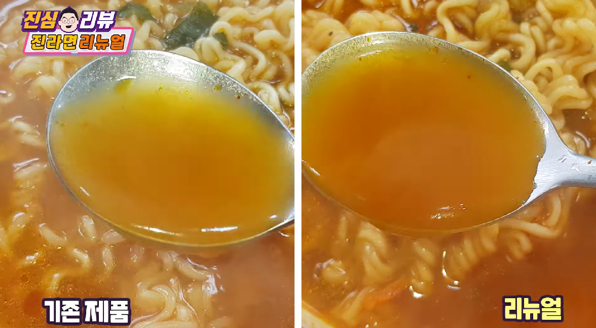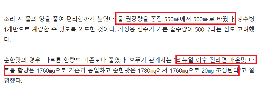 진라면 순한맛이나 매운맛이나 포장지에 물 권장량이 500ml 로 되어 있다면 리뉴얼된 제품이다.