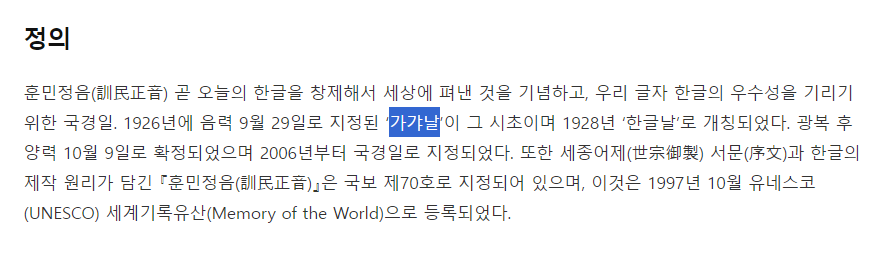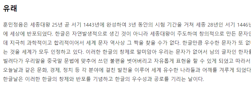 유래는 다들 아는 내용이다. 세종대왕이 훈민정음을 세상 반포하고 한글의 창제와 반포를 기념하는 날이다.