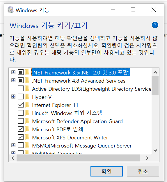 이렇게 뜨는데 위에 2개 .net 선택하고 확인을 눌러 설치를 해주면 된다.