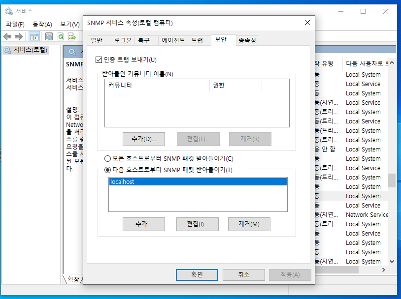 snmp 윈도우 설정이다. 윈도우7 기준 우선 snmp 설치를 해야 한다.프로그램 추가 제거 - windows 기능 사용/사용 안함에서 snmp 모든거 선택 확인 누르면 설치 완료 시작 - 실행services.msc 해서 윈도우 서
