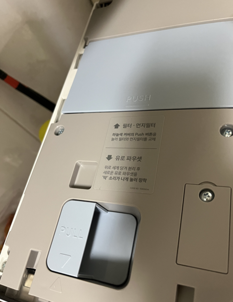 나는 필터 교체이니 윗커버를 열자 누르면 열린다.