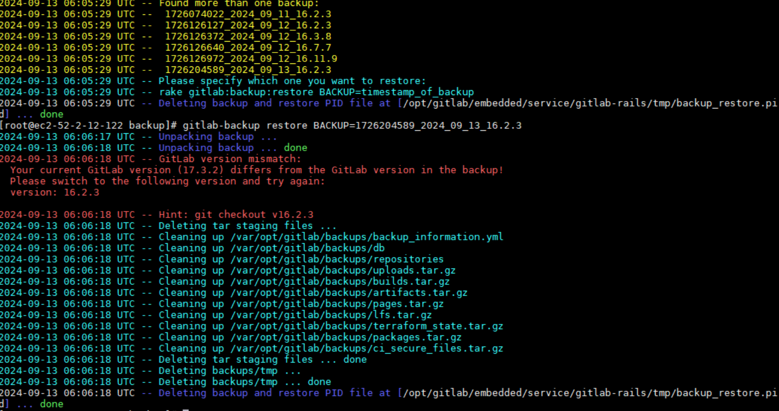 이렇게 서버 버전은 17.3.2 버전인데 백업 버전은 16.2.3 버전이라고 가정하면
