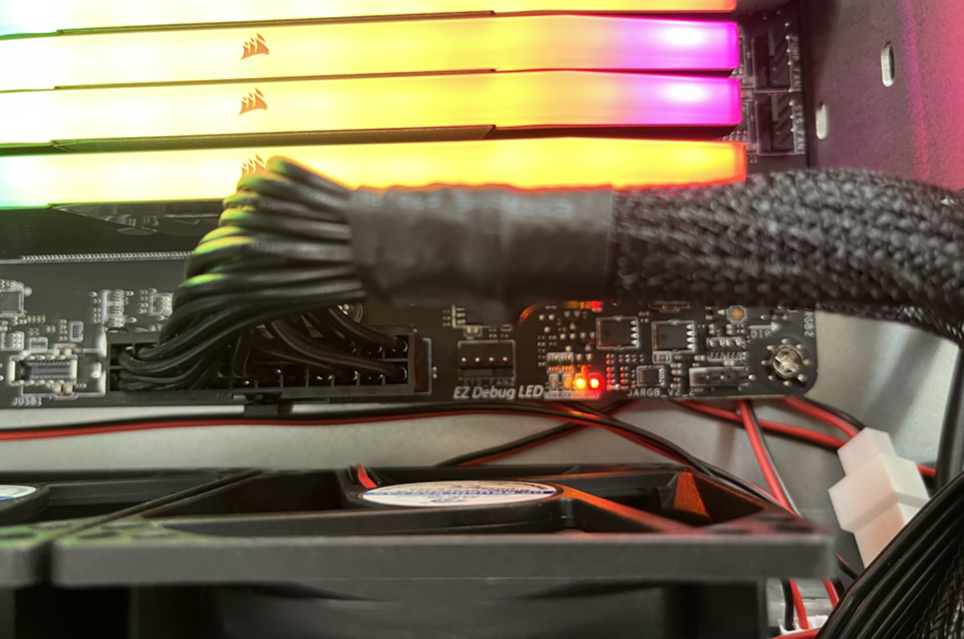 메인보드에 보면 EZ Debug LED 가 있다. 보면 RAM 이 주황색이다. 메모리가 정상적으로 인식이 안되는것 같다. 보통 이런경우 바이오스 업그레이드 하면 정상인식 된다.
