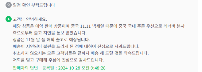 배송일정이 확 뒤로 밀렸다. 이런건 공지를 해줘야지 다른 사람들 보면 문자로 일정 딜레이 됐다고 왔다는데 나는 안왔다.