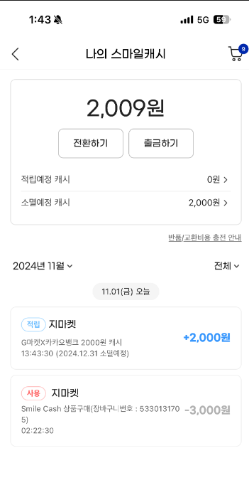 현금처럼 사용 가능한 스마일캐시가 충전 된다.
