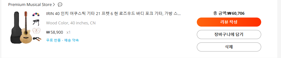 여튼 알리에서 저렴하게 구매 했다. 약 1주일 정도 걸렸고 기타는 부피가 다 커서 그런지 배송비 별도로 해서 6만원 정도에 구매 했다. 고로 기타값만 5만원 정도라 생각 하면 된다.