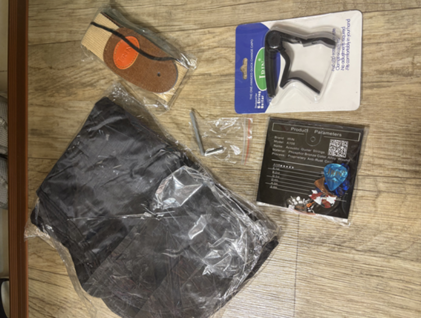 구성품은 가방, 기타 끈, 여분의 기타 줄, 기타 초크 5개, 기타 줄잡아주는거(이름을 잘모르겠다.) 이 있다.