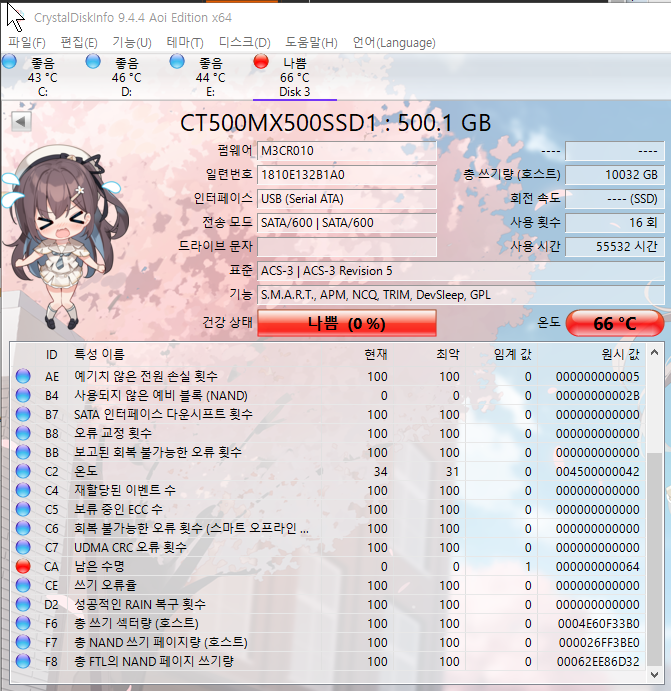 크리스탈인포상에서는 10032GB 즉 10TB인데 TBW 에 한참 못믿치는데..? 왜 저렇게 에러가 뜨지?