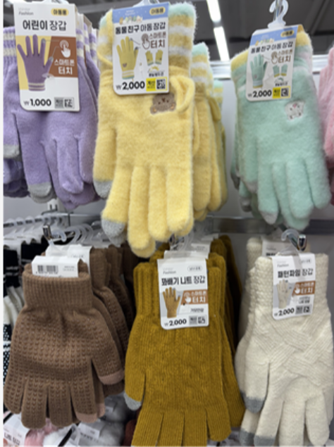 그중에 1,000원짜리 니트 장갑을 선택했다. 가격도 저렴하고 촉갑도 좋다. 제일 마음에 드는건 스마트폰 터치 가능!!