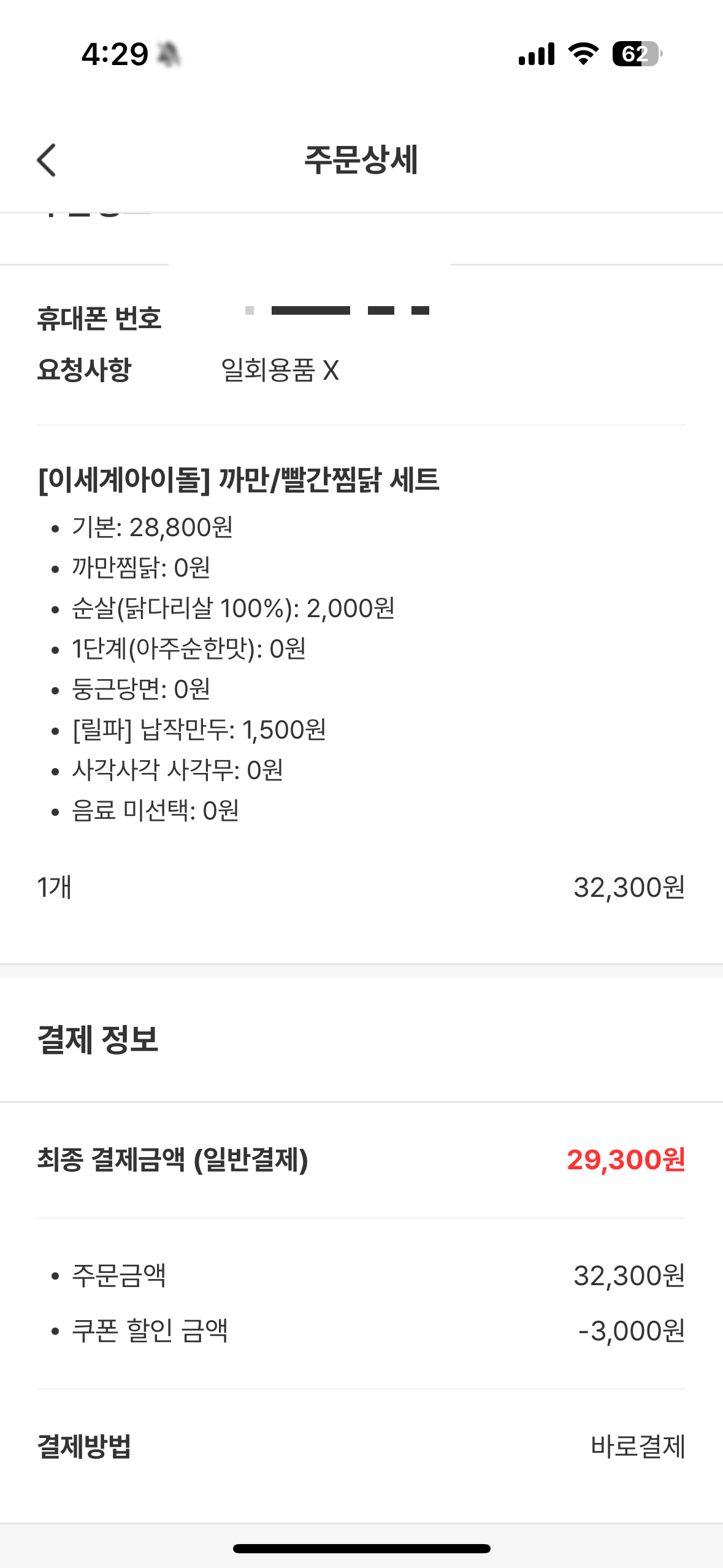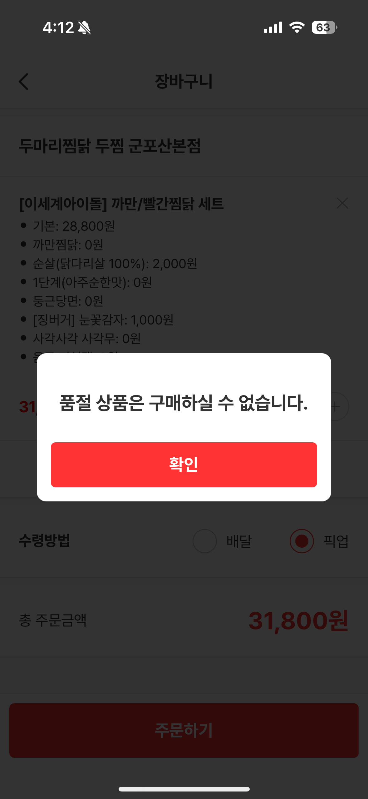 빠르게 다시 메뉴 변경해서 주문했는데 성공이다. 당연히 배달은 안되서 포장으로 주문 완료!