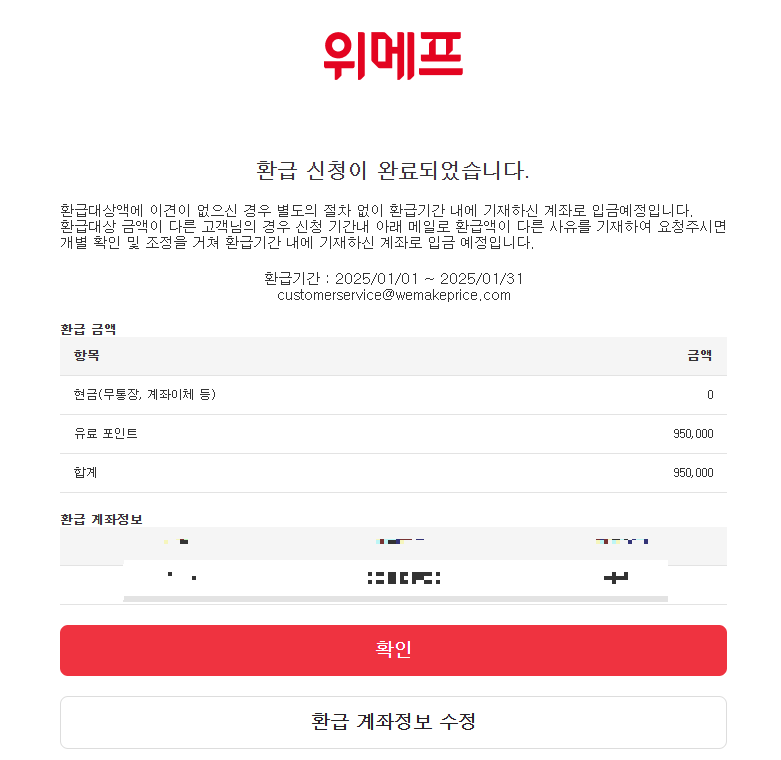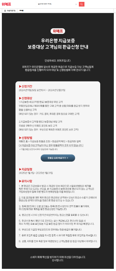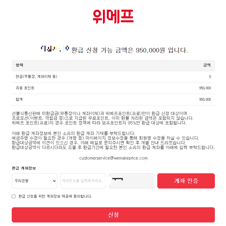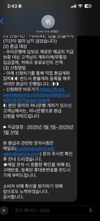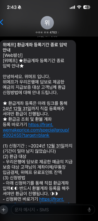 위메프 환급계좌 등록기간 종료 임박?? 문자