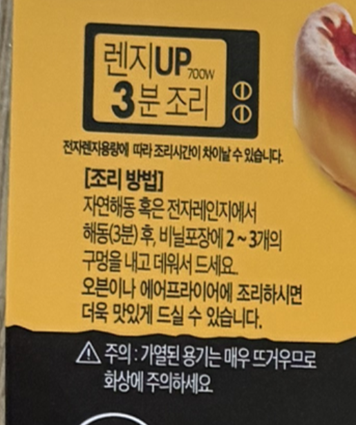 렌지는 3분 비닐포장에 2~3개 구멍을 내고 데워서 먹으면 된다고 한다.