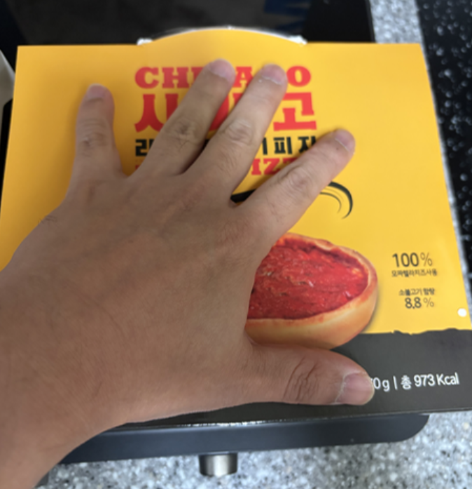 사이즈는 이렇게 작다 성인 혼자 먹으면 부족할듯 하다. 피자라 그런지 역시나 973칼로리나 한다.