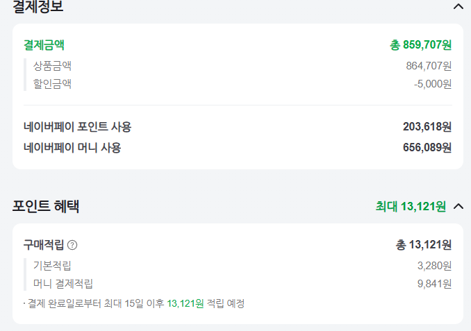 -5,000원 -13,121원 하면 네이버 결제 총 금액은 846,586원이다.
