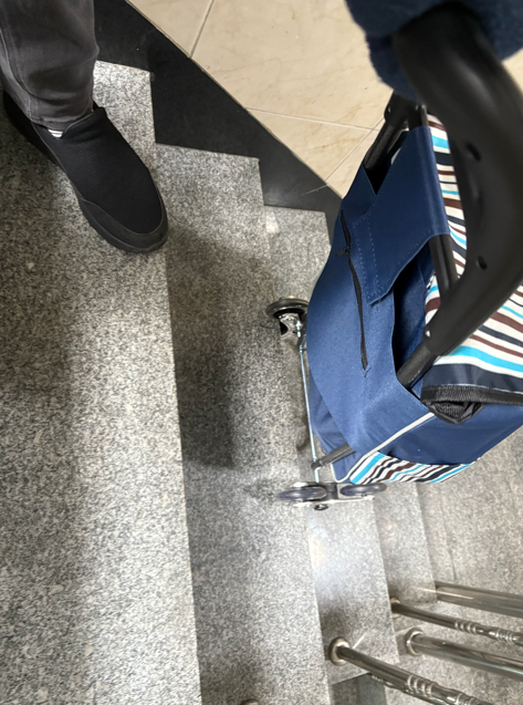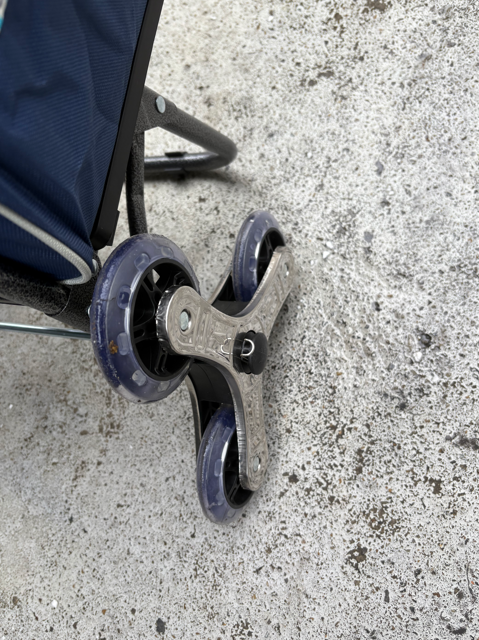 인라인 바퀴 같고 3발이다. 판매처에 보면 계단을 손쉽게 올라갈수 있다고 되어 있다. 특이점은 왼쪽 오른쪽 바퀴 색상이 다르다. 왜 다르지..?