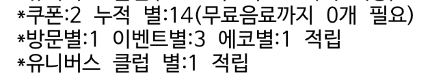 이상태에서 시크릿 이벤트 별 5개 2/12일에 적립까지 포함 하면 1잔 먹었을때 총 11개(유니버스,에코빼면9개) 적립 되는것이다.