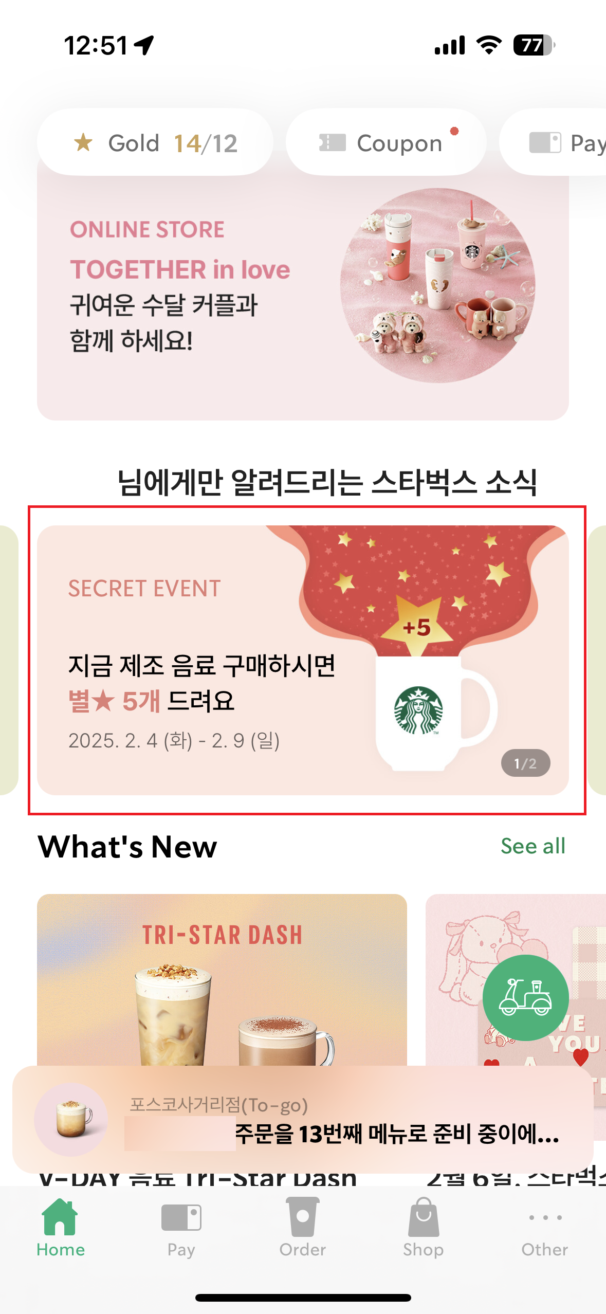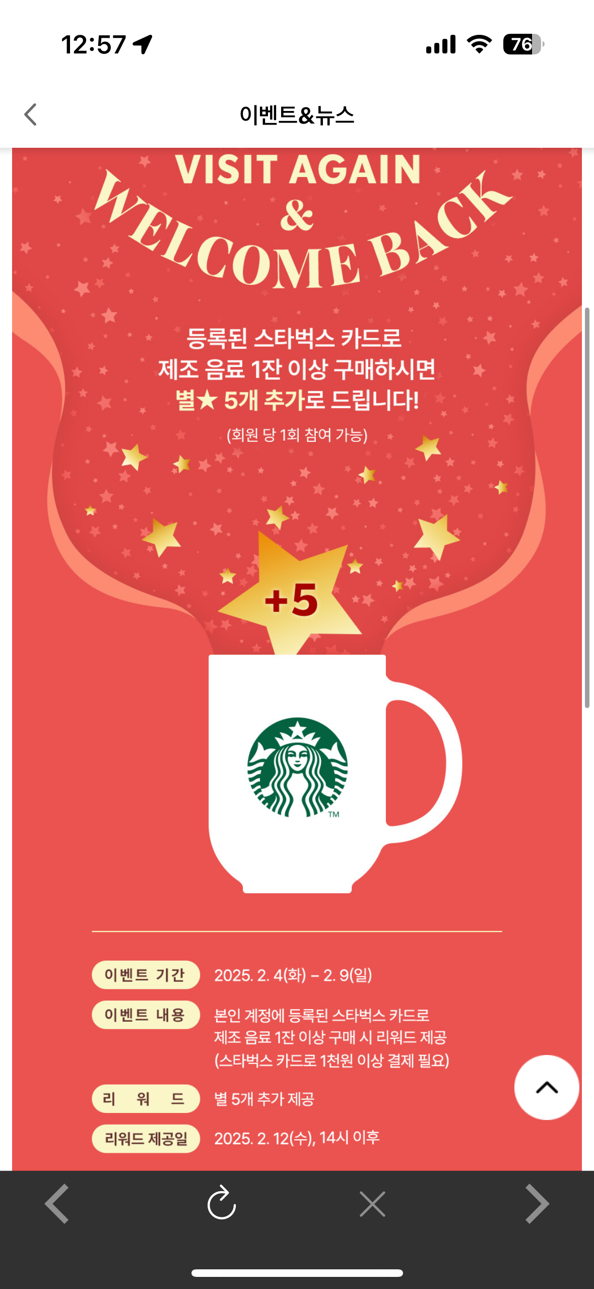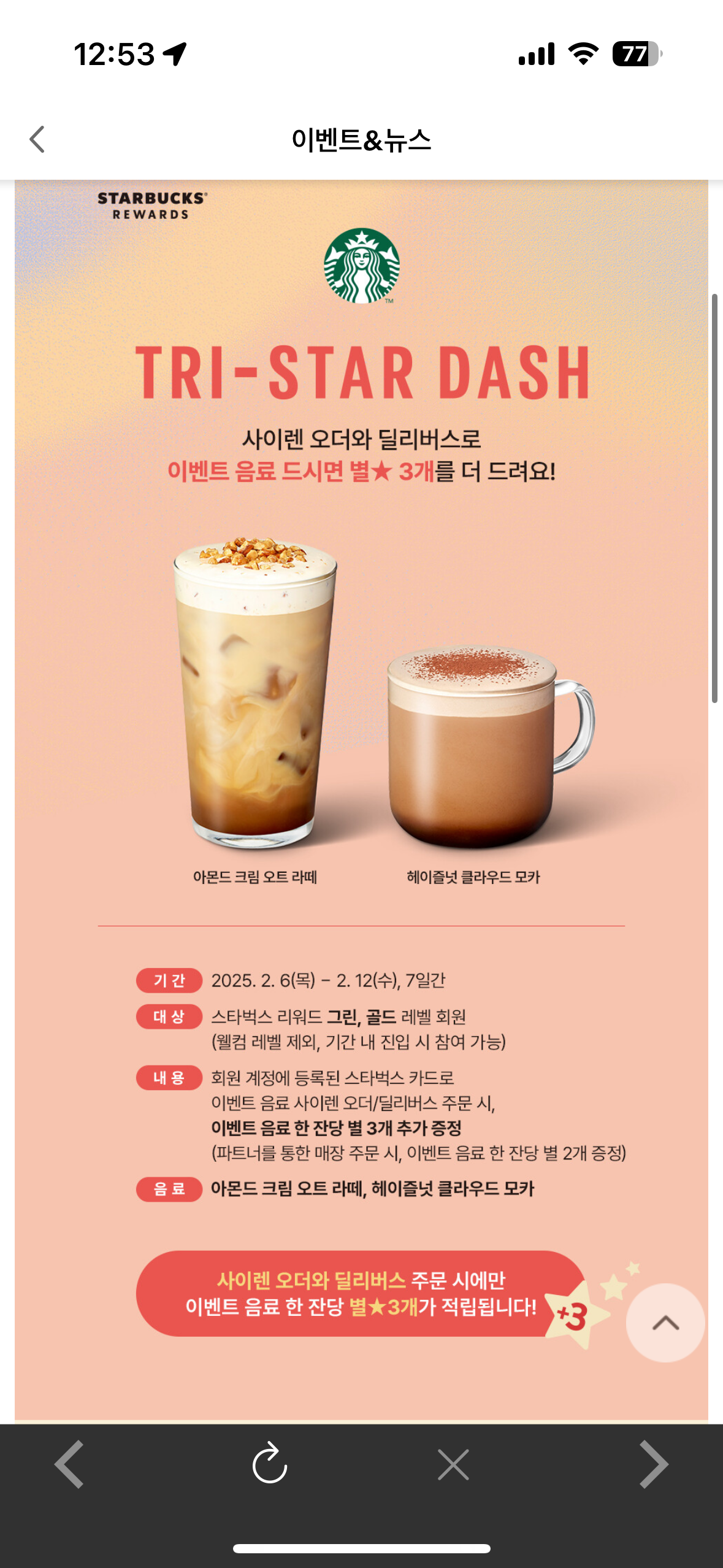 이벤트 음료 한잔당 별 3개 추가 증정 이벤트를 하고 있다 날짜는 살짝 다르지만 2/6 ~ 2/12일까지 한다.