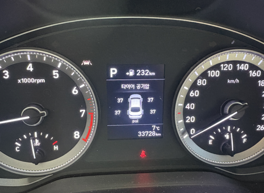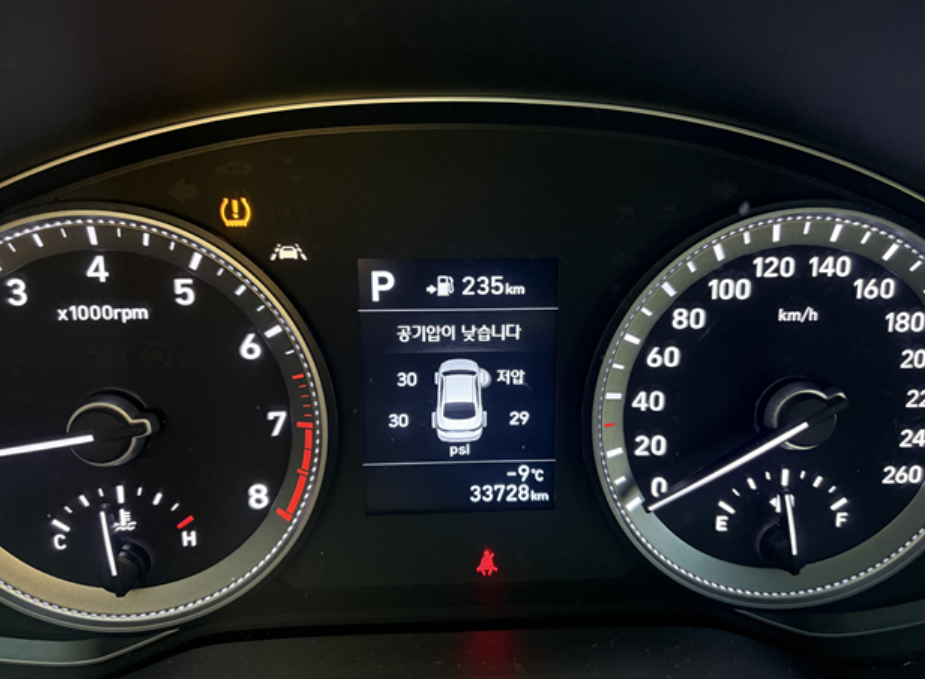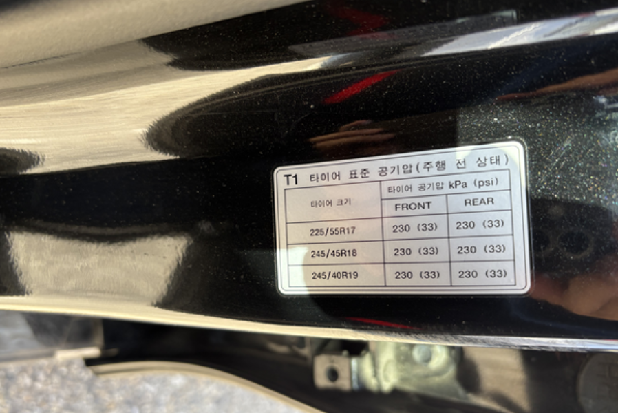 내 차는 앞뒤 모두 PSI 33 맞추면 되는데 겨울철은 보통 4~5 더 넣어주면 된다.