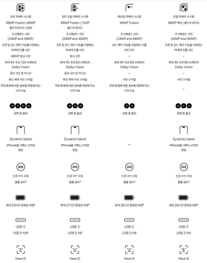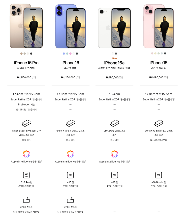 대충 보면 알겠지만 16에 비교해서 CPU 코어가 1개 부족 하고 카메라 1개 없고 다이나믹 아일랜드도 없고 0.1인치 사이즈 작고 카메라컨트롤 없고 맥세이브도 없고.. 가격은 16보다 26만원 저렴하다. 음... 그럼 그냥 26만원 더 주고 아이폰16 사는게 좋은게 아닐까 생각이 든다.