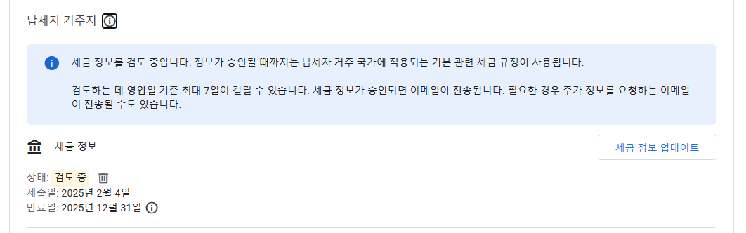 이전에 위 링크처럼 해서 세금정보 등록을 했었는데 또 떠 있었다. 아마 주기적으로 해야 하는듯 해서