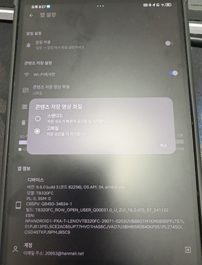 콘덴츠 저장 화질을 설정 할 수 있었다. 스탠다드/ 고화질 고화질로 저장하고