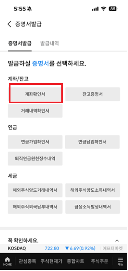 그럼 증명서 종류가 여러게 있는데 내가 원하는건 계좌확인서이기 때문에 선택을 하자.