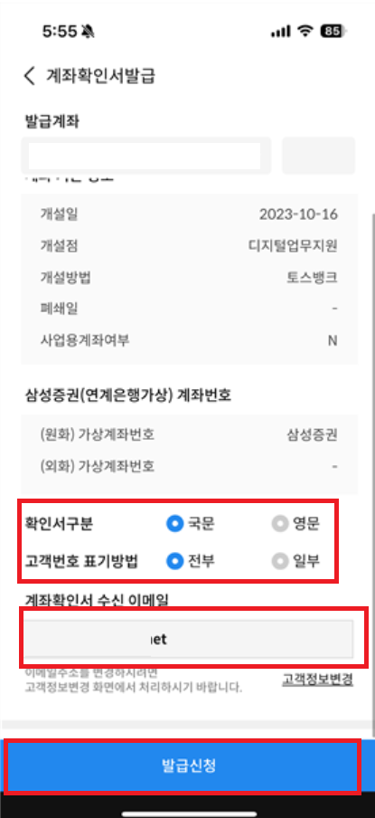 국문으로 할지 영문으로 할지 선택과 고객번호 표기방법을 전부 혹은 일부만 할건지 선택 후 이메일 주소를 입력하고 발급 신청 누르면 끝난다.