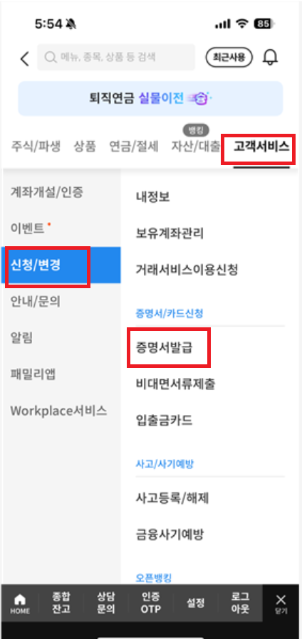 고객서비스 - 신청/변경 - 증명서 발급 순으로 눌러보자.