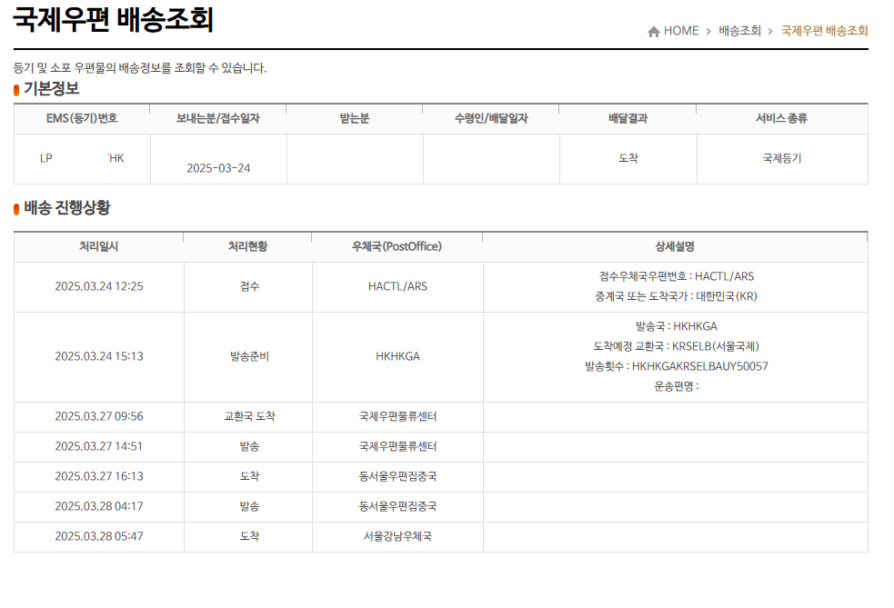 우체국으로 들어가서 LP 로 시작되는 송장번호를 조회 해보면(국내로 들어와야 우체국에서 조회가 된다.)