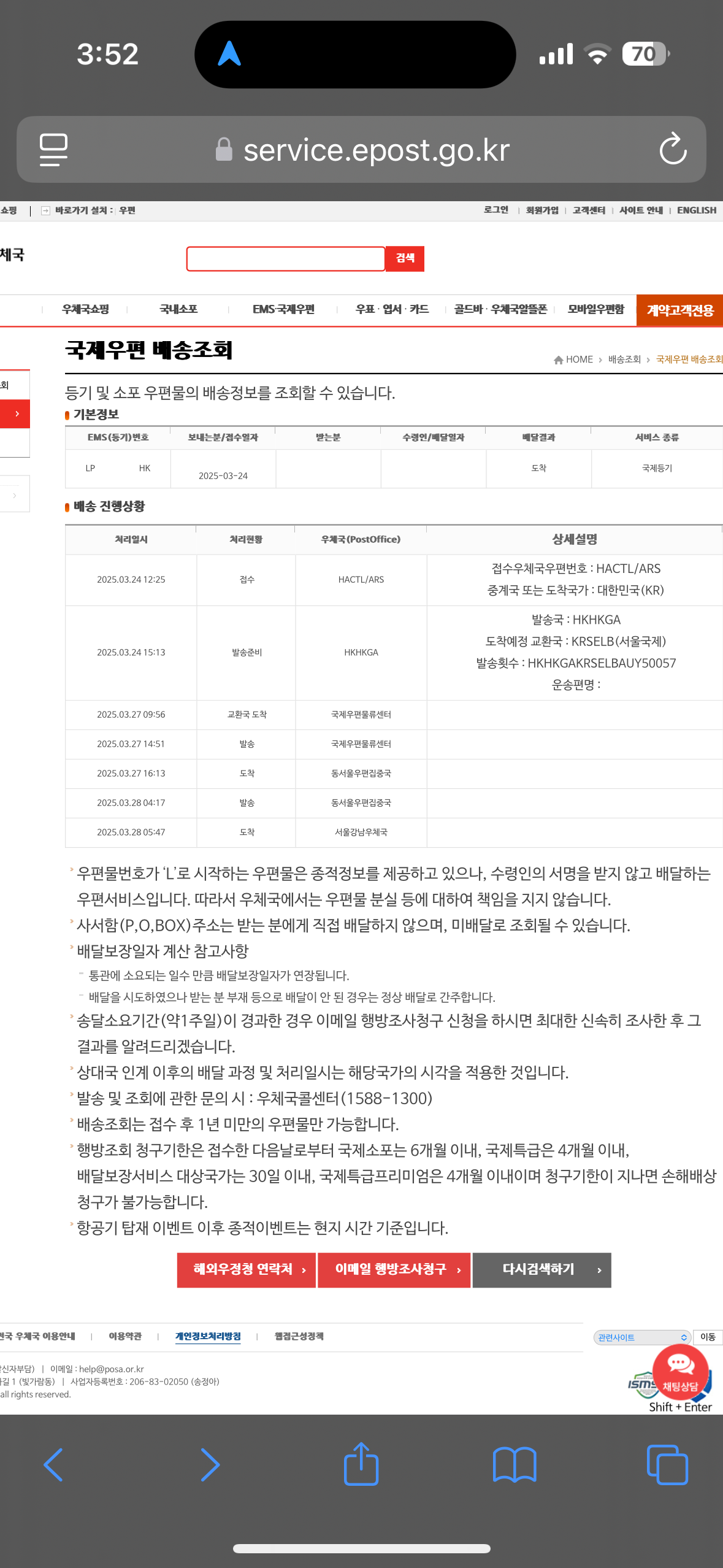 강남우체국에 도착 이고 이후로 멈춰 있다. 국제택배가 아닌 국제우편일때 고려사항이 있다.