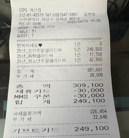 기프트카드 900원남았다. 그래서 내가 총 빕스에서 쓴 총 돈은 212,500+3,500(할인권구매비용) -900원 = 215,100원 주고 먹었다.