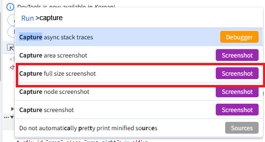 capture 라 입력하면 여러가지 명령어가 뜨는데 full size screenshot 을 선택 하면