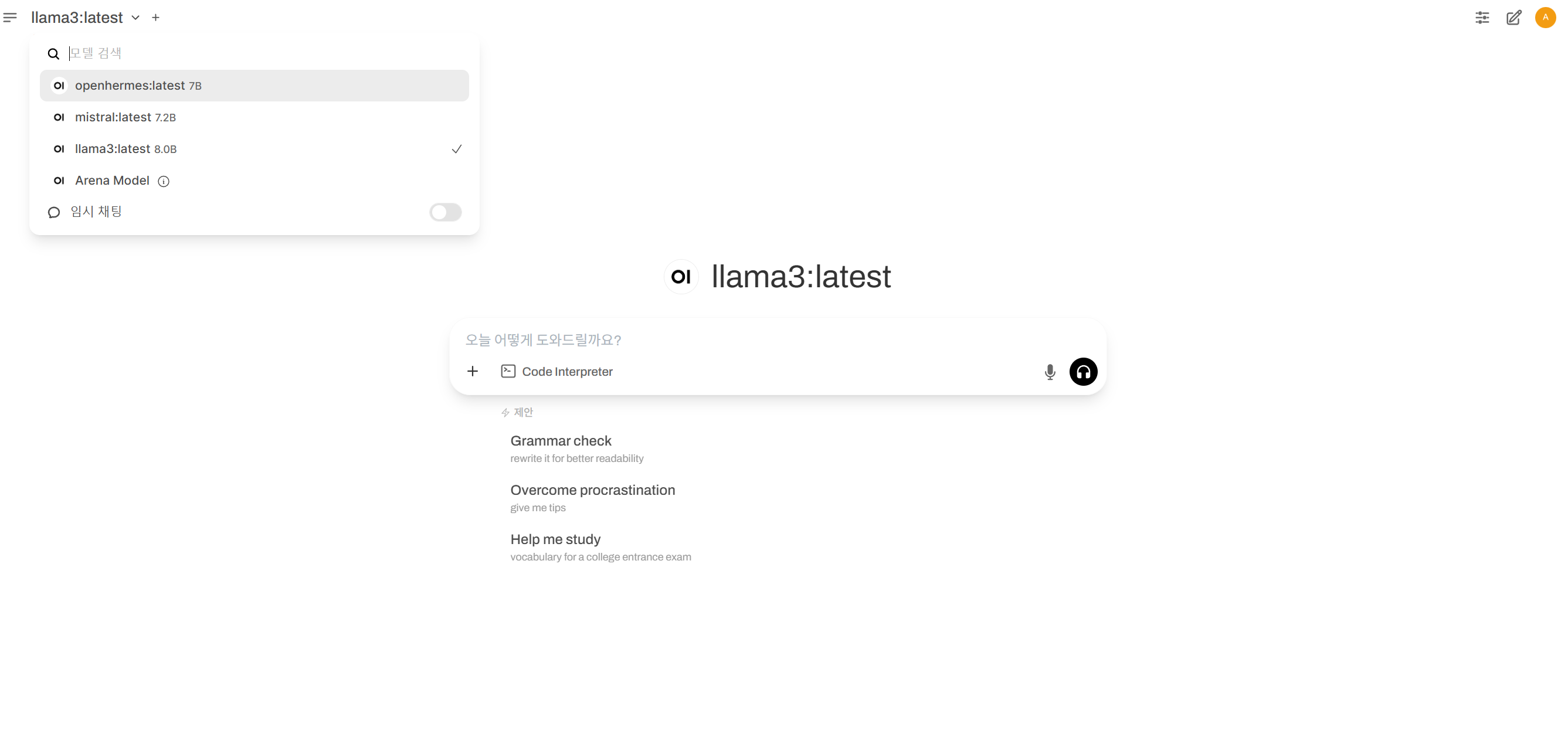 docker 에 ollama + webui 에 llm 올리는 방식이다.
