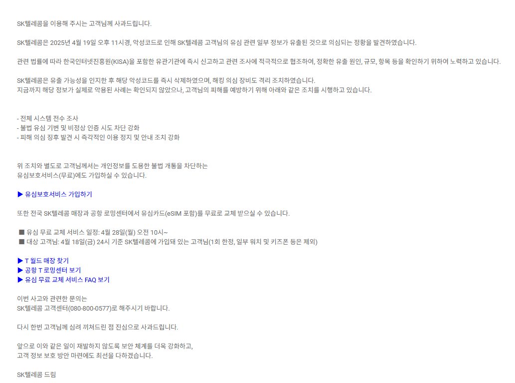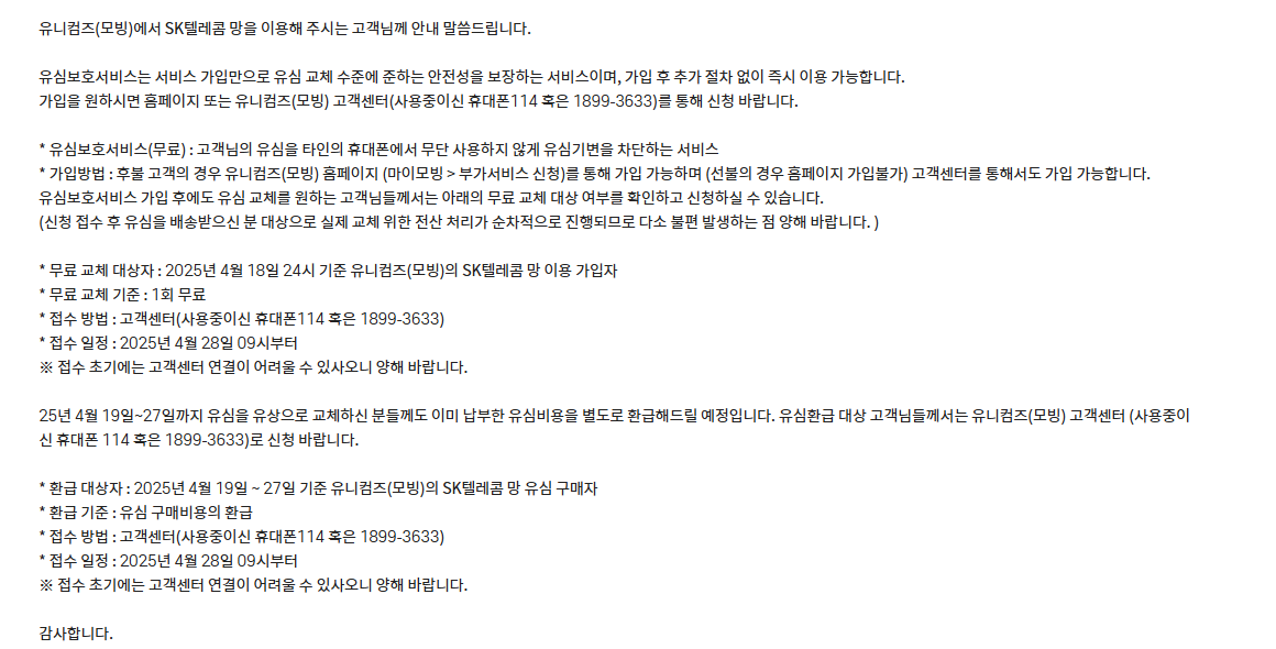 두번째는 SKT 매장에서 28일 부터 유심 무상 교체를 해준다고 한다. 찝찝하니 무조건 교체를 하자.