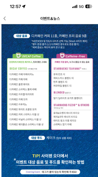 다시 이벤트 시작! 뭐 조금 다르긴 한데 디카페인 한해 오후5시 이후 음료만 30프로 음료+케익 하면 음료만 50프로 할인 이벤트 중이다.