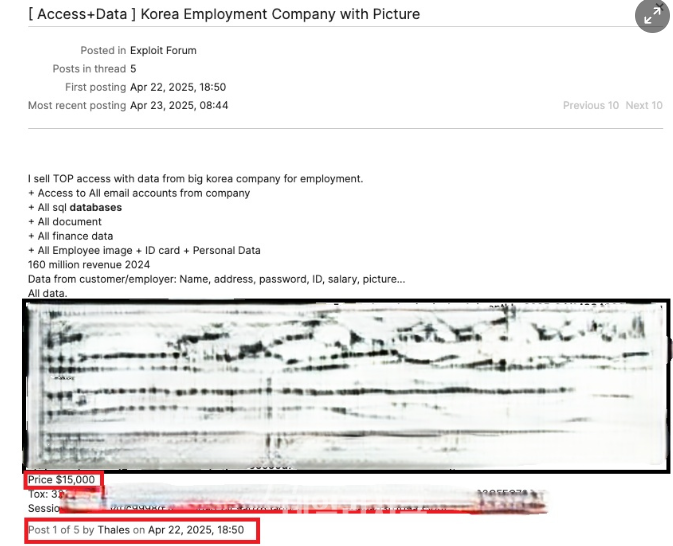 [단독] 해커, KS한국고용정보 22GB 분량 내부 데이터 유출…다크웹서 15,000달러에 판매중 - 데