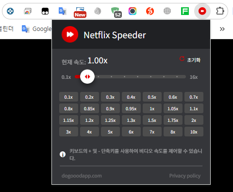 이렇게 netflix Speeder 라고 뜨고 배속을 체크 할 수 있다. 오리지날에서 지원하는 배속이 아닌 다양한 배속을 지원한다.