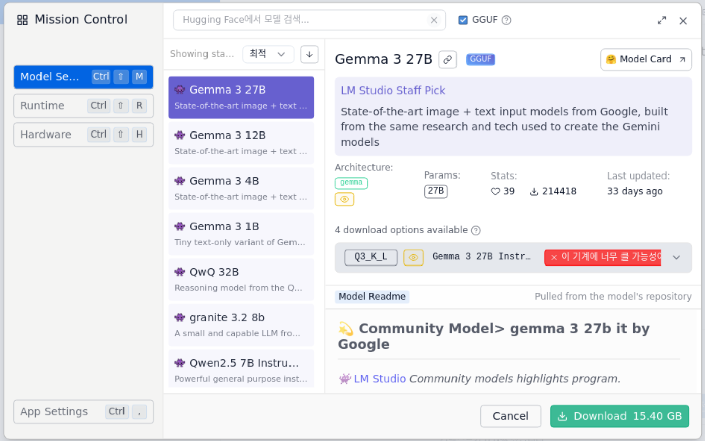 추천 LLM 버전이 나오는데 난 deepseek r1 이 나온다 추후 다른것으로 변경도 가능하니 뭐 우선 다운로드 눌러서 진행해주자.