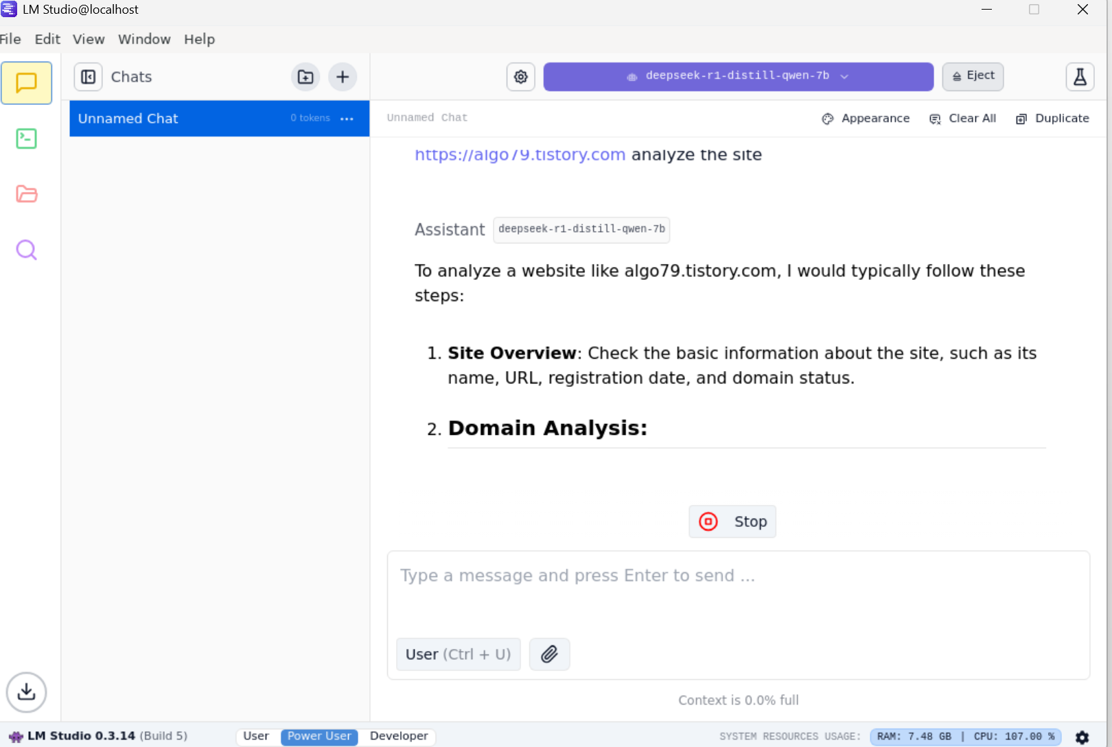 설치가 다 되면 이렇게 로컬에서 chatgpt 처럼 구동이 된다. 원하는 LLM 을 선택을 하고
