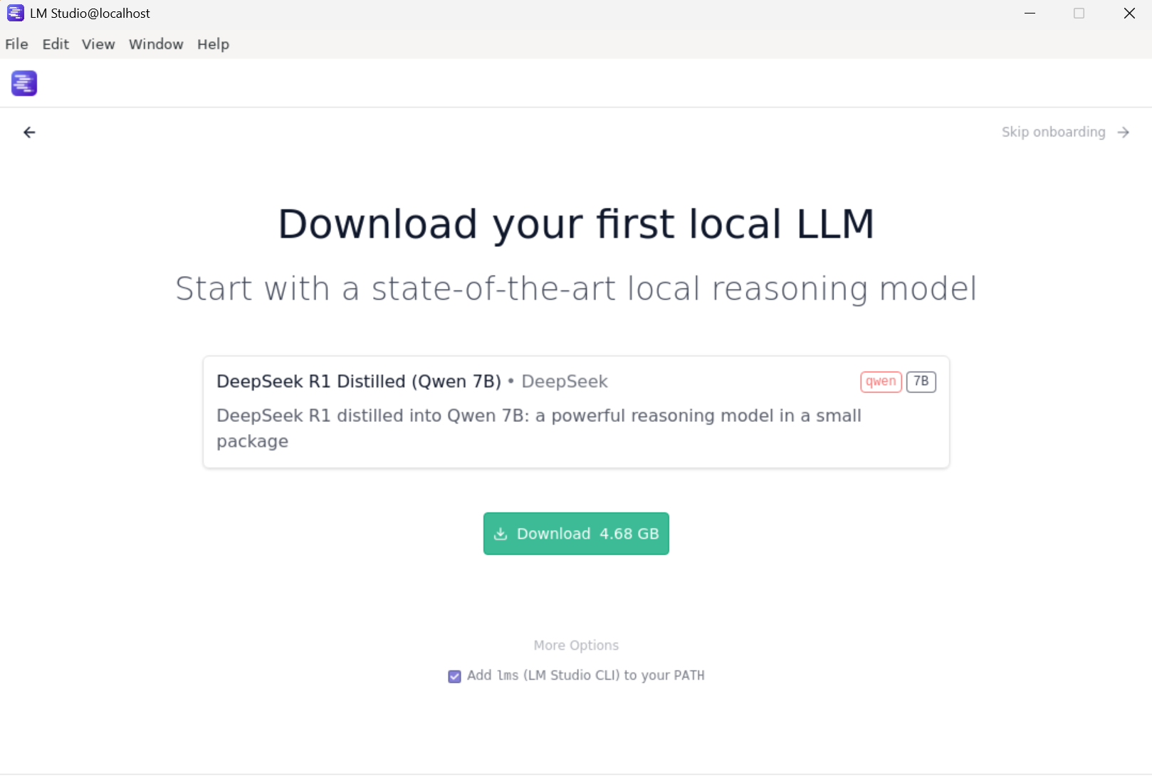 구동을 하면 이렇게 LLMS locally on your computer 라고 뜨면서 GUI 화면이 뜬다. Get your fires LLM 누르면