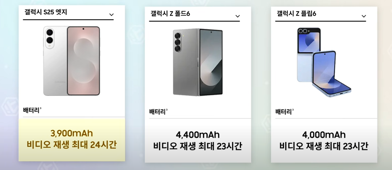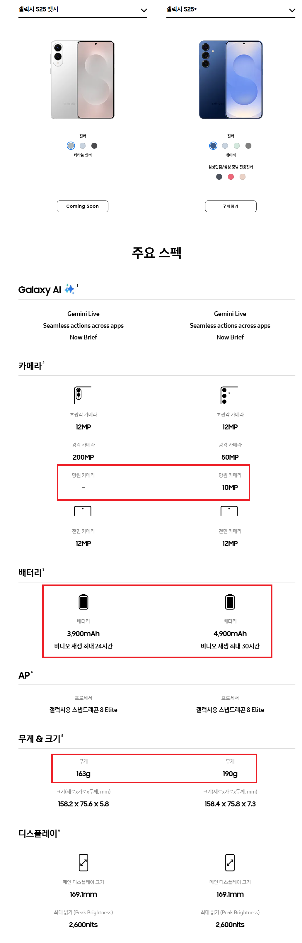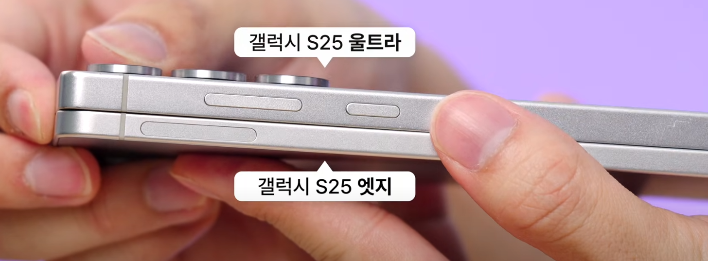 크기가 갤럭시S25+ 와 똑같으니 S25+ 와 비교 하면 가벼워진 무게, 망원카메라없고, 작아진 배터리 1,000mAh 이다.