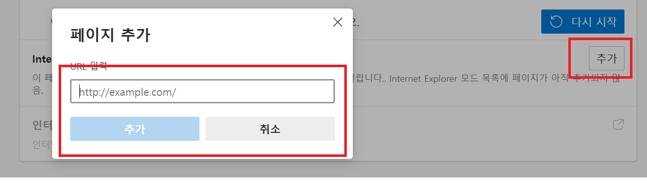 내가 접속 하는 페이지 URL 추가 하고 엣지를 다시 시작하면