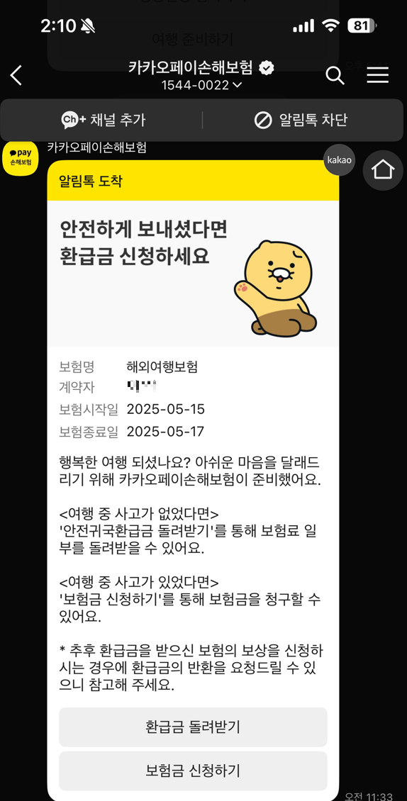 여행갔다 오고 다음날 이렇게 카톡이 온다. 문제가 있다면 보험금 신청하면 되고 없다면 환급금 돌려받기 누르면 된다.