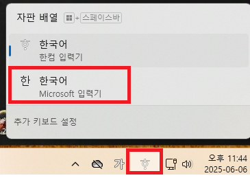 저 이상한 빨간색 박스를 눌러보니 한국어 입력기가 2가지가 나온다 MS 와 한컴꺼가 나온다. 문제는 한컴 입력기가 저렇게 이상하게 출력이 되었던 것이다.