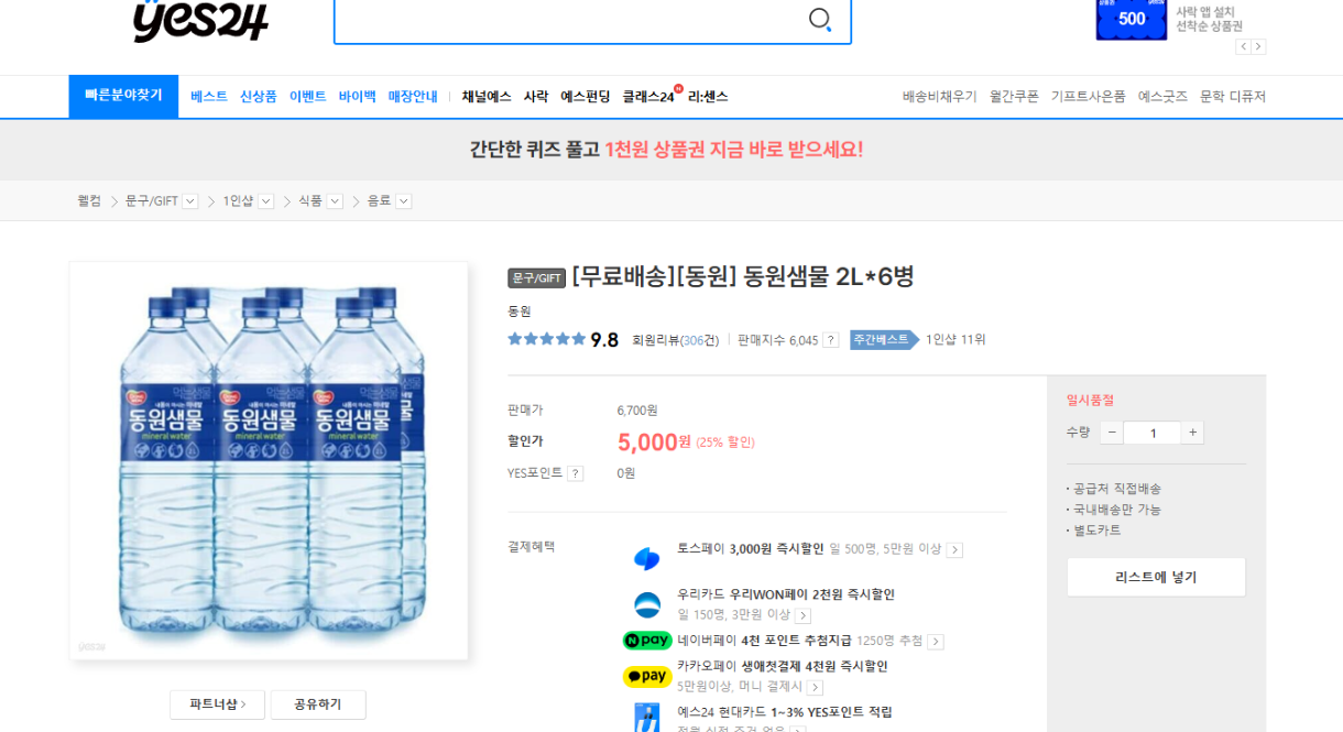 ㅎㅎㅎ 생 양아치네. 할인율을 바꿔서 5천원짜리가 이제는 없다. 너무하네..... 500 ~ 1,000원 더 내고 생수를 구매하자.