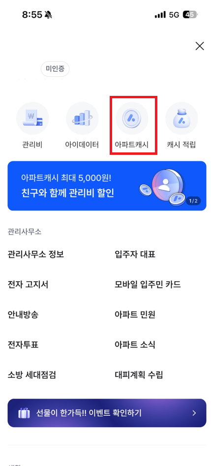 이렇게 뜨는데 아파트캐시를 눌러보자.