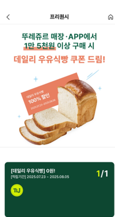 네이버페이와 적립 같이 진행해서 데일리 우유식빵 쿠폰도 받았다. 인당 데일리우유식빵 쿠폰은 1개만 쓸수 있으니 8월1일날 진행하는 이벤트는 다른 사람것으로 진행하면 식빵을 하나 더 얻을 수 있다. 뚜레쥬르 어플은 CJ계정으로 로그인 하면 된다.