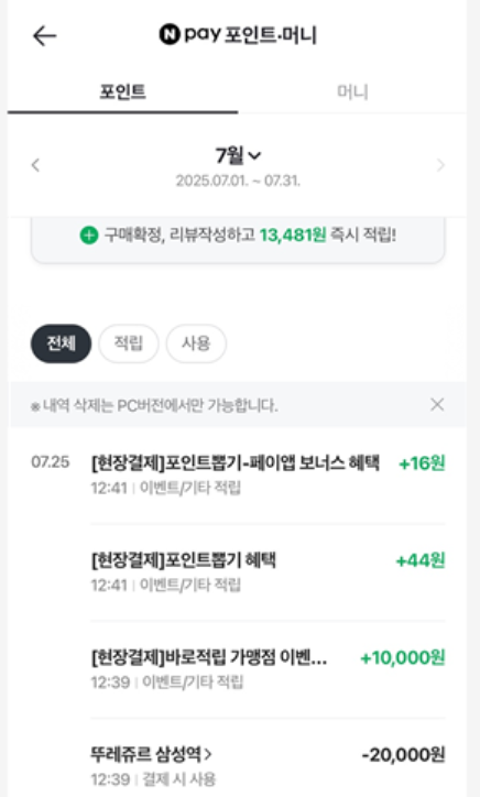 아참 적립은 바로 안되고 최대 10분정도 걸린다.