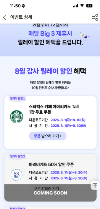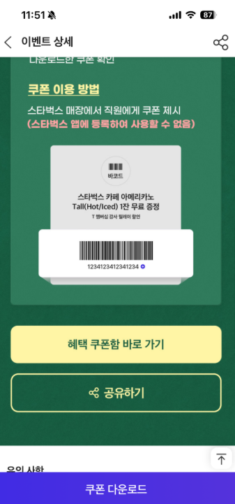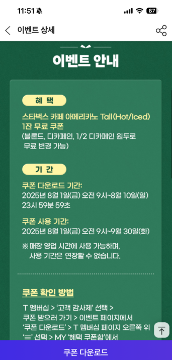 T 멤버십 고객 감사제 무료 스타벅스 아메리카노 쿠폰 받은 방법